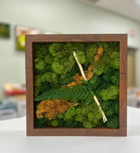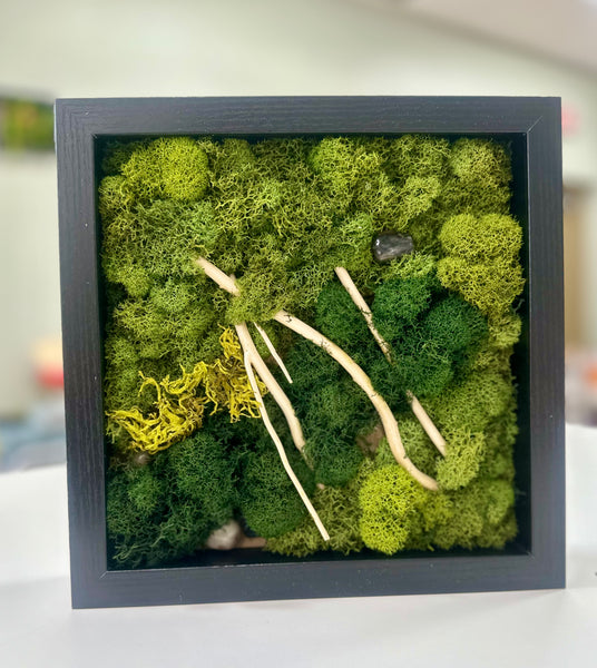 This 9 x 9-inch modern frame brings elements of nature into your environment. Each is unique and includes a curated arrangement of preserved mosses, stones, branches, ferns, and other surprises, such as wood or nature-inspired accents. Surprise yourself, no two are alike. Frame color options available: black, brown, and white.