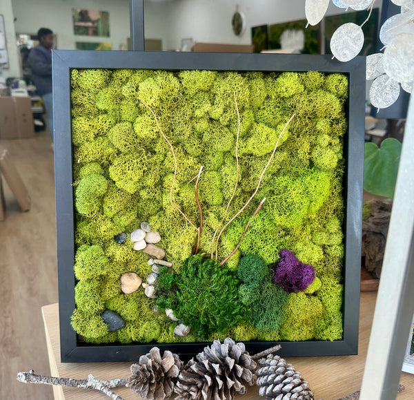 All-natural elements are preserved and require no additional maintenance. Keep away from direct sunlight. Best if kept in environments with 30 percent humidity to keep moss soft. If the moss becomes dry, mist lightly as needed. Avoid direct sunlight. Not suitable for outdoors. Allow one week for new art.