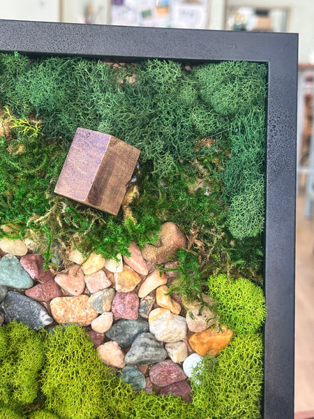 A 12 x 12 inch frame with nature in abundance. Moss, river rock, wood accent and memories of times near the river and the woods. A symbolic cabin or home is included. Does this make you remember a special place?